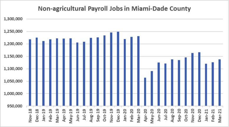 In March 2021, the not seasonally adjusted unemployment rate in Miami-Dade County was 8.2 percent. From February 2021 to March 2021, there was an increase of 7,800 nonagricultural payroll jobs, which is a 0.7 percentage point increase. Many sectors have begun adding jobs. The County had a reduction of 82,500 nonagricultural payroll jobs (not seasonally adjusted), from March 2020 to March 2021 which was a 6.8 percentage point decrease, still reflecting the COVID-19 crisis.