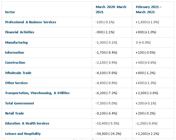Between March 2020 and March 2021, every sector saw a decrease in the number of non-agricultural payroll jobs. At the same time, the change in non-agricultural payroll job between February 2021 and March 2021 shows that many sectors are adding jobs during that time period.