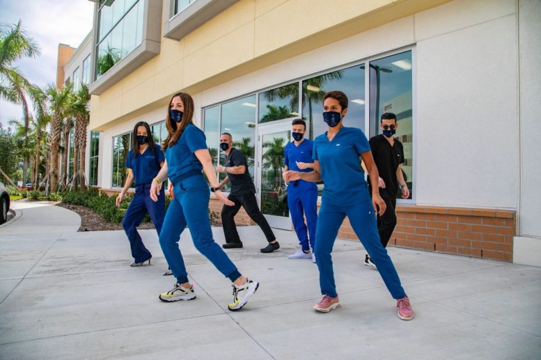 Drs. Tish Stephens, Daniel Padron, Laura Pumarejo, Fayez Ajib, Bruno Moraes and Eva Ryder put on their dancing shoes (or, better yet, dancing scrubs) and followed along as choreographer Sean Green of Sean’s Dance Factory taught them the popular social media routine. After a few rounds of practice, the doctors were prepared to perform together – on camera – to bring some hope and joy to TikTok and healthcare workers everywhere.