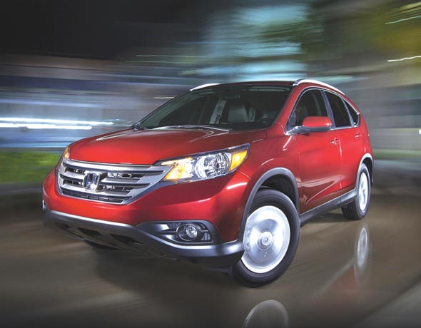The Honda CR-V body is designed to contribute to high fuel efficiency and vehicle safety while enhancing the functional aspects of the entry-level SUV. It has an aggressive, aerodynamic stance with deep sculpting of the bodylines and a bold front fascia. The highly rigid unibody construction combines with lightweight suspension components, noise insulation and aerodynamic features, including underbody covers and a rear spoiler to enhance a quiet and quality ride. Large five-spoke wheels (17- inch alloy for the CR-V EX and EX-L, and 16-inch steel for the CR-V LX) and bold fender flares emphasize the dynamic look and capability. Pricing on the 2013 Honda CRV starts at $22,695.