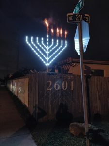 This year’s menorah lighting is done with the recognition of the crucial need for a message of hope during a time that is so difficult for the people in Israel. The menorah serves as a symbol of light and hope for us today amidst the world’s craziness, as it did for generations before us. The flames of the menorah shine out into the night, reminding us that even when confronted with much darkness, a tiny light can dispel it all. Each additional act of goodness and kindness, fills that corner of the world with light, slowly catching on and spreading like wildfire. One act of goodness and kindness can make all the difference.