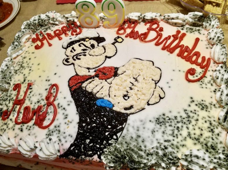 Food (so much food!) and friends (so many friends!) and great camaraderie filled the home of Herb Barker, owner of Barker Animation Art Galleries, as he celebrated his 89th birthday in style. Popeye, the beloved Disney cartoon fictional character created (appropriately) 89 years ago, was the party theme. Betty Boop, another famous Disney character, was on full display in memory of Gloria Barker, Herb’s wife who recently passed away.