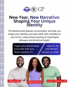 Barbershop Speaks launches 2026 with a powerful community conversation, “New Year, New Narrative: Shaping Your Unique Identity,” on January 31, 2026, at 7:00 PM at ToppCuttaz Barbershop in Miami Gardens. Designed as a moment of reflection, renewal, and courage, the event creates a welcoming space for individuals to explore personal growth and gain practical tools for defining and expressing their authentic selves. RSVP at https://partiful.com/e/U8H0SWQXQgsI6U6CPLn2?c=rWZoIZro.