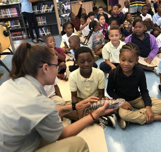 But unlike 2016, when more than 250 third graders visited Jungle Island from four different elementary schools as part of the Biscayne Bay Kiwanis/Jungle Island School Attendance Incentive Program, the Kiwanis brought Jungle Island — temporarily closed due to Hurricane Irma — to the schools.