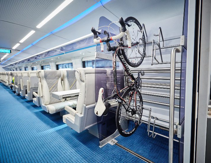 For checked baggage, there is a compartment at the end of the last Smart coach. There are luggage towers in each coach for larger carry-on bags, as well as overhead luggage racks and under-seat storage for small personal items. To encourage more car-free transportation, Brightline also welcomes bikes. There are bike racks on every train, so guests can ride their bike to the station and bring it onboard with them.