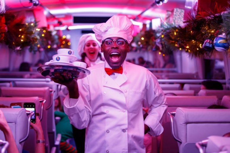 Passengers then read along with the classic children’s book, The Polar Express, by Chris Van Allsburg. Santa and his helpers board the train to greet passengers and each guest is given the first gift of Christmas.