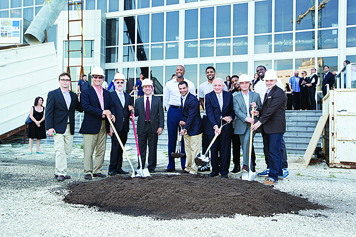Pictured are (l-r, front row) Luke Cerrone (RDC), Joe Cerrone (RDC), Doyle Betsill (CGI), Brian Goodkind (CGI), Miami Commissioner Francis Suarez; Miami Mayor, Tomás Regalado, Juergen Steutz (Meliá), Roy Kelin (The One Group/STK); (back row) Alonzo Mourning, Udonis Haslem, Mario Chalmers and Luol Deng.