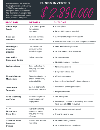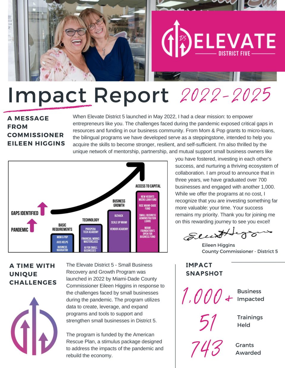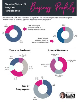 The conference builds on the success of Elevate District 5, a program created by Commissioner Higgins in 2022 that has supported over 1,000 local businesses, hosted more than 50 training sessions, and awarded nearly 750 grants to entrepreneurs (see impact report).
