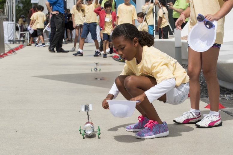 Brooke Lawson, 9, a Phillip and Patricia Frost Museum of Science summer camper, races her solar rover to the finish line on the museum’s Science Plaza during Florida Power & Light Company’s inaugural “Day of Solar” on June 21. The event is part of FPL’s partnership with Frost Science, which includes the donation of photovoltaic solar panels located on the Florida Power & Light Company Solar Terrace at the museum as well as the installation of two solar trees on the Science Plaza.