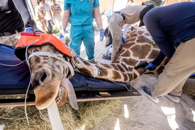 Because of a giraffe’s extraordinary anatomy and size, the greatest challenge was safely immobilizing Mia and keeping her under anesthesia while maintaining her vital signs at a healthy level. Adult giraffes are one of the most challenging animals to anesthetize with the possibility of not being able to recover from anesthesia being a serious risk.