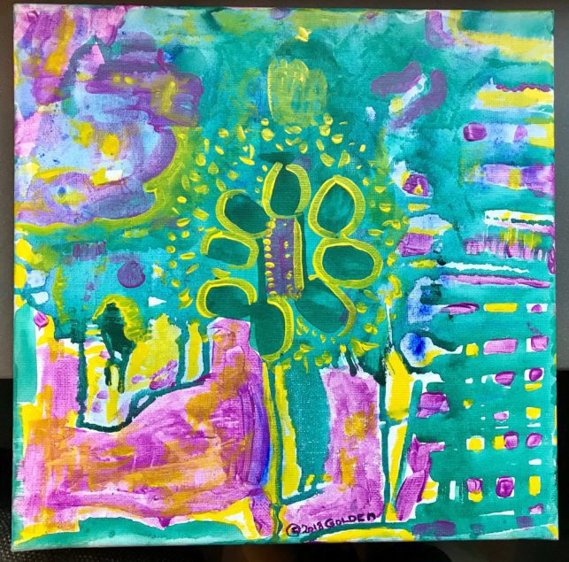Golden eventually moved west to Santa Cruz, Calif., where she had seven solo art shows over four years there. She was written up in several local newspapers and her painting was chosen to grace the poster for the Survivors Healing Center where she also curated its art shows for two years. Golden’s art hung and sold in a few stores and galleries in the area.
