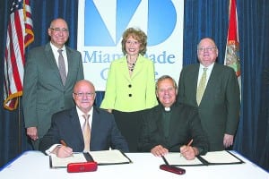Miami Dade College president Dr. Eduardo J. Padrón (seated left) and St. Thomas University president Rev. Monsignor Franklyn M. Casale sign a new academic agreement between the institutions during a ceremony on Aug. 8. The cooperative agreement will help MDC students in its Bachelor of Applied Science in Supervision and Management program enter St. Thomas University’s Master of Science in Management program through an automatic enrollment process. Also pictured (l-r, back row) are MDC provost Dr. Rolando Montoya, St. Thomas University’s Susan Angulo and J. Antonio Villamil.