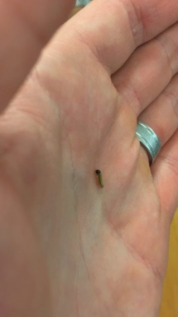 These extremely small caterpillars feed on the flowers in the Black Olives, are often seen suspended on silk-like thread (bungee), and should disappear within two to three weeks as they transition from caterpillar to small gray moth (nocturnal butterfly). While they are a nuisance, they do not pose a health and safety threat to humans or animals.