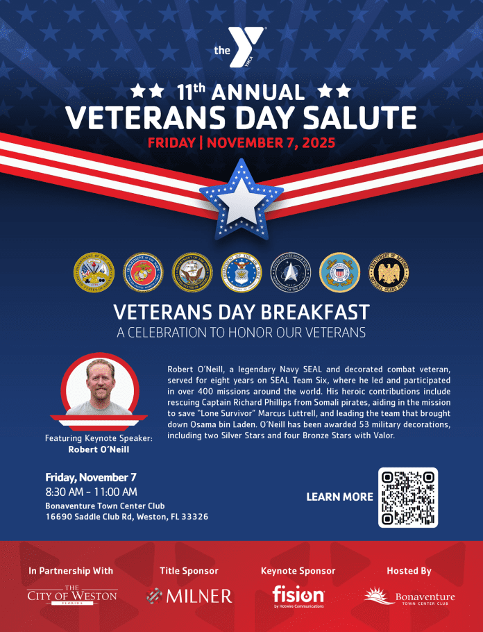 The YMCA of South Florida, in partnership with the City of Weston, will honor former and current military members during its 11th annual Veterans Day Salute, presented by Milner Technologies, on Friday, November 7 from 8:30 to 11:00 a.m. at the Bonaventure Town Center Club, 16690 Saddle Club Road in Weston.