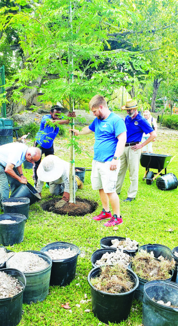 On Friday April 26, the Rotary Club of South Miami joined forces with the South Miami Garden Club at Fuchs Park. The two organization purchased two large trees in large 45 gallon pots for Arbor Day. Ladies from the South Miami Garden Club watched as City workers planted their tree on one side of the park while South Miami Rotarians pitched in and helped plant their tree on the other side of the park closer to US 1 . Among the Rotarians assisting the South Miami’s Parks workers plant the trees were Rotarians Jeff McNabb and Sabrata Basu.