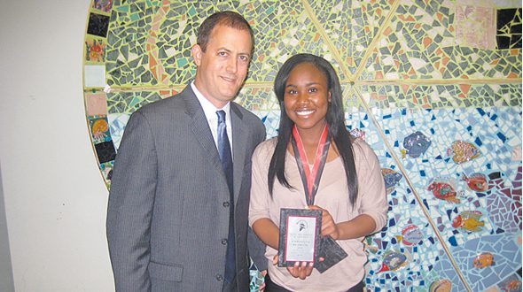 Christina Redwine of Miami Southridge Senior High School is presented the Diego Family Spartan Scholarship Award by Keith Diego during the school’s annual Awards Ceremony on May 11. The criteria for the one year, $2,500 award includes excellence in academics, dedication to community service and well-rounded participation in extracurricular activities. The recipient also must be attending a four-year college outside of the tri-county area. The scholarship was created by the Diego Family (Miami Southridge alumni) to recognize annually one Miami Southridge student who exhibits the Spartan Spirit and to help encourage and assist them in their efforts when leaving home for a well-rounded college.