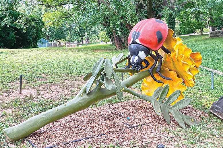Visitors can see large-scale robotic insect sculptures such as this ladybug throughout the garden.