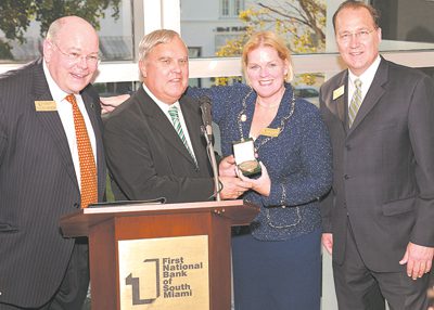 Pictured (l-r) are Bruce Wirtz MacArthur, FNBSM board chair; Coral Gables Mayor James Cason; Veronica Birch Flores, FNBSM executive vice president, and Drew A. Dammeier, FNBSM president.