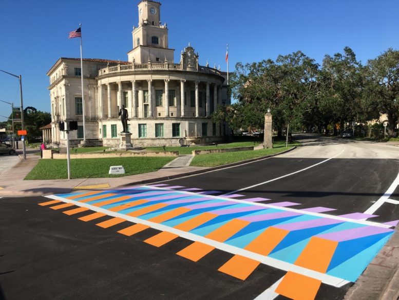 Recognized by Art Basel Miami, the City of Coral Gables is showcasing elements of Cruz-Diez works throughout Downtown Coral Gables, including City Hall. Thirteen banners are hung between each of the columns in front of City Hall, and eight crosswalks are painted with original designs specifically done for this project.