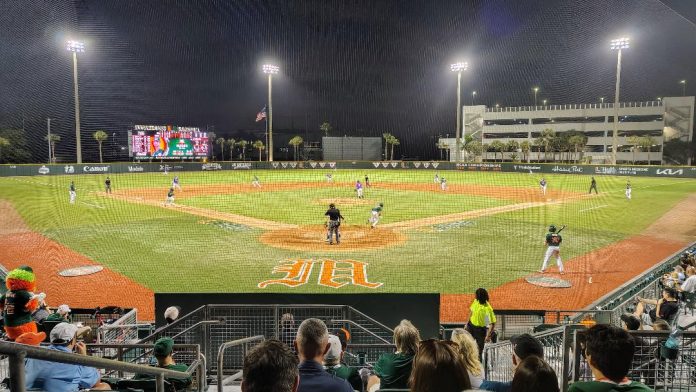 Griffin displayed dominance on the mound, while Tanner Smith electrified the atmosphere at the plate with a flawless 4-for-4 performance. He came tantalizingly close to completing the cycle, showcasing an impressive lineup of two doubles, a single, and a standout triple leading off the 6th inning, ultimately finishing the night with 3 RBIs. The last Cane to hit for the cycle was Gaby Sanchez back in May 2003. Riding the wave of success was Todd Hudson, who matched Tanner’s perfection with a stellar 3-for-3 night, also racking up 3 RBIs and punctuating his performance with Miami’s first home run of the season, soaring 345 feet to left field in the 3rd inning. Together, Tanner and Todd were pivotal, contributing to 7 of Miami’s 12 hits and driving in 6 of the 10 runs.