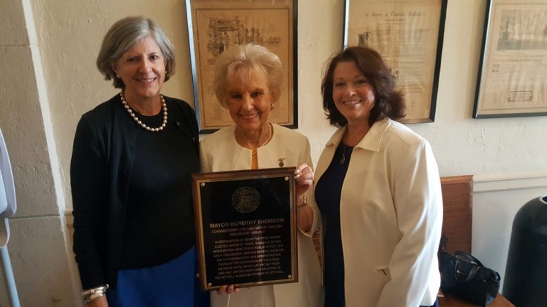 Former Coral Gables Mayor Dorothy Thomson was recognized recently with the unveiling ceremony for a plaque installed at City Hall in her honor as the first and, thus far, only female mayor of the city. Mayor Raul Valdes Fauli, former Mayor Jim Cason, and city manager Cathy Rivenbark were among those who addressed the crowd to praise Dorothy for her positive impact on the city during her terms in office as well as her leadership in numerous non profit organizations.