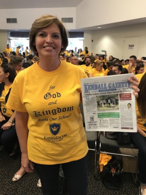 Iliana Perez, founder of Kingdom Academy, is pictured with the Kendall Gazette at a lengthy zoning hearing by the West Kendall Community Council on Apr. 26 at Kendall Village Center Civic Pavilion. She and more than 250 students and parents gathered to support the school’s application to build a new campus at the corner of SW 157th Avenue and 136th Street. Despite this sea of yellow Academy shirts, the request was denied.