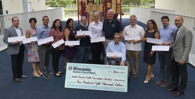 The Kiwanis Club of Miami, Florida’s oldest Kiwanis club, presented $108,000 to 12 different community youth recreational groups during a special ceremony on June 1 at the Village of Allapattah YMCA. Through the Miami Kiwanis Youth Foundation, the club has distributed nearly $1.4 million since the year 2000. Pictured (l-r) are Alex Rodriguez-Roig (Boys & Girls Clubs of Miami); Victoria Hopta (Chapman Partnership); Antonio Lorenzo (Little Havana Kiwanis Foundation); Gigi Del Valle (Children’s Resources Fund); Jessica Osman (United Community Options of Miami); Kevin Bender (Perrine Baseball & Softball Association); Amanda Stoutenour (Good Hope Equestrian Training Center); Chuck Little, president of the Kiwanis Club of Miami; Harry Horgan (Shake A Leg Miami); Lloyd Van Blyvelt (Grace Contrino Abrams Peace Education Foundation); Jessica Cerda-Antomarchi and Alex Markel (Junior Orange Bowl Committee), and Gabriel Ochoa (YMCA of South Florida). The $108,000 total was the third largest single day distribution in the 96-year history of the Kiwanis Club of Miami.
