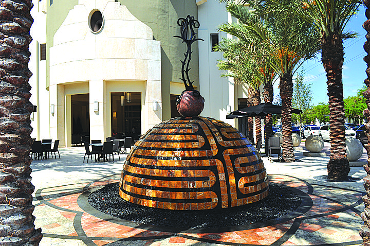 In the courtyard of the new Gables Ponce development near the Village of Merrick Park, a metal rose sprouts from a domed labyrinth made of stone.