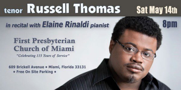 Miami native Russell Thomas returns to the concert stage in a recital accompanied by Orchestra Miami’s artistic director Elaine Rinaldi at the piano.