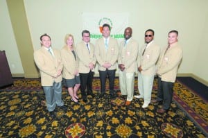 Pictured is University of Miami football coach Al Golden with the new members of the UM Sports Hall of Fame during the 43rd annual induction banquet on March 24th at Jungle Island. This year’s class includes(l-r) NCAA champion diver Tyce Routson, Olympic diver Daphne Jongejans Bousquet, former women’s tennis coach Ian Duvenhage, football star Dan Morgan, Coach Golden, Indianapolis Colts star Reggie Wayne, the Washington Redskins Santana Moss and baseball star Bobby Hill. NCAA track champion Yolanda McCray could not attend. The UM Sports Hall of Fame is located on the UM campus adjacent to the Hecht Athletic Center and houses memorabilia and artifacts from more than 80 years of Hurricanes athletics, including championship trophies, retired jerseys, two Heisman trophies, photos and other historical displays. For more information, go to UMSportsHallofFame.com.