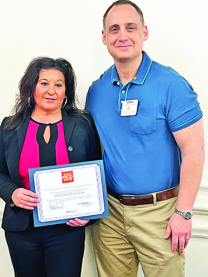 Following her talk, RCCG president Greg Petrino presented her with a certificate showing the club had donated polio vaccinations for 10 children in her name.