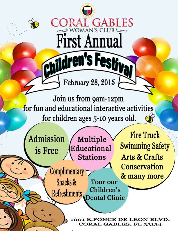 Coral Gables Women’s Club Children’s FestivalThe inaugural CGWC Children’s Festival will take place on Feb. 28, during Dental Health Month. from 9 a.m. to noon. at the clubhouse located, 1001 E. Ponce de Leon Blvd. in Coral Gables.