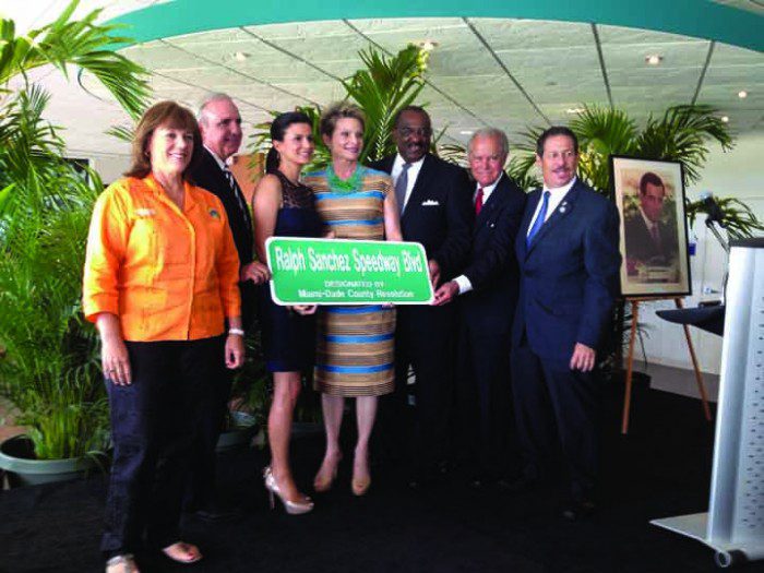 In ceremonies on July 12 at Homestead-Miami Speedway (HMS), Miami-Dade County officials co-designated the roadway that runs in front of the track as “Ralph Sánchez Speedway Boulevard.” Pictured (l-r) are Commissioner Lynda Bell, Mayor Carlos A. Giménez, Ralph Sánchez’s daughter Patricia Sánchez-Abril, Ralph Sánchez’s wife Lourdes Sánchez, Commissioner Dennis C. Moss, Commissioner Javier D. Souto, and Commissioner Jose “Pepe” Diaz.