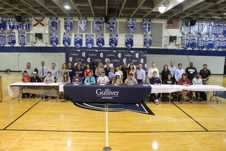 During a ceremony on Apr. 19 at Gulliver Preparatory School, 13 student-athletes — including two soccer players, two tennis players, two softball players, two lacrosse players, one football player, one sailor, two swimmers, and one rower — committed to continuing their athletic careers at the collegiate level.