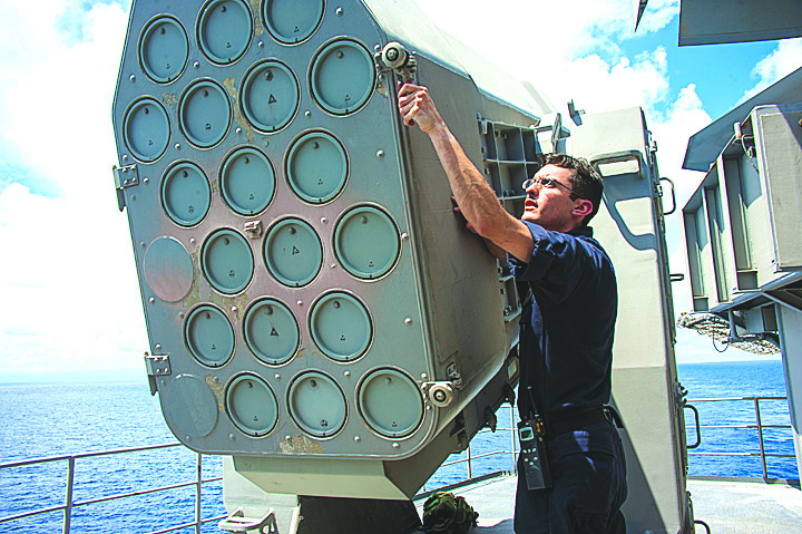 Fire Controlman Second Class Miguel Moreno, from Homestead, performs maintenance on a Rolling Airframe Missile System (RAM) on the flight deck of the Nimitz-class aircraft carrier USS George Washington (CVN 73). George Washington and its embarked air wing, Carrier Air Wing (CVW) 5, provide a combat-ready force that protects and defends the collective maritime interests of the U.S. and its allies and partners in the Indo-Asia-Pacific region.