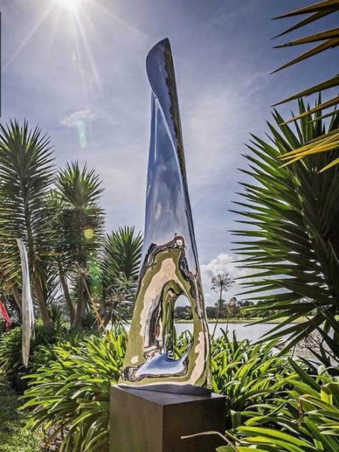 The highly polished mirror-finish stainless steel sculptures seemingly morph in shape and color as the day goes from dawn to dusk, creating timeless masterpieces full of light and movement. At night, color LED lights bring shades of red and blue to the sculptures adding another dimension to their beauty.