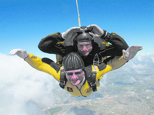 The group participated with the U.S. Army Golden Knights Parachute Team at Homestead Air Reserve Base, doing tandem jumps from a plane at 13,500 feet.