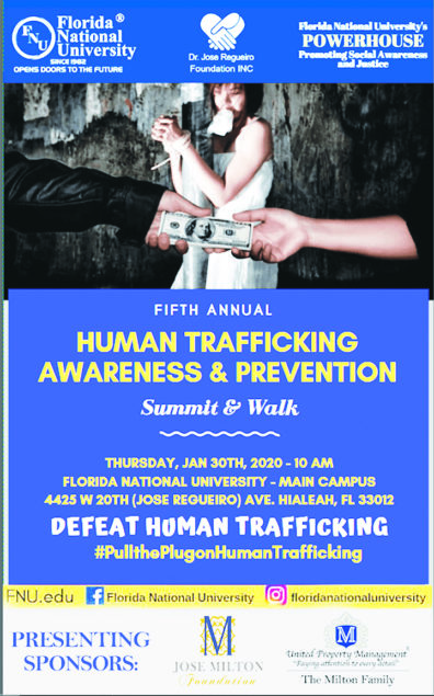 Florida National University (FNU), the FNU POWERHOUSE, and the Dr. Jose Regueiro Foundation, Inc., are orchestrating the Fifth Annual Human Trafficking Awareness & Prevention Summit & Walk to take place Jan., 30, 2020 at 10 a.m.