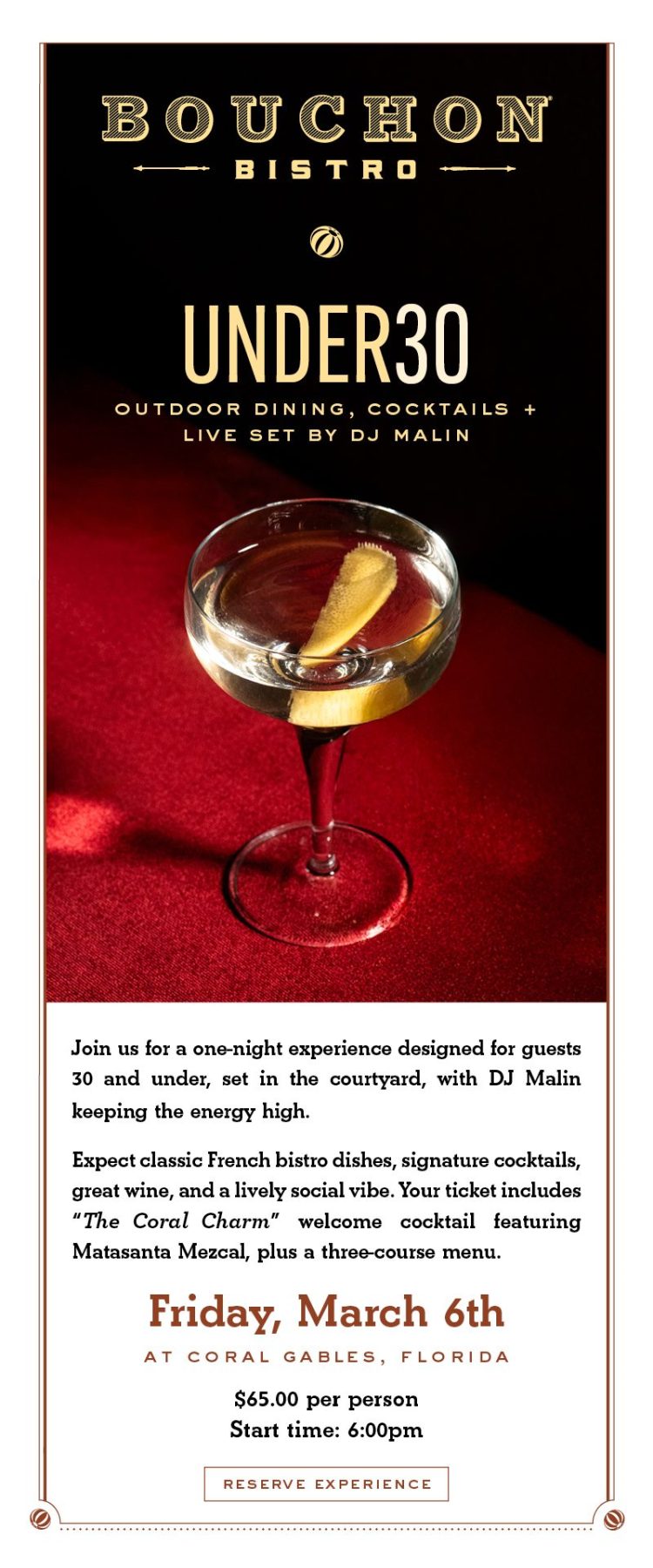 Join us for a one-night experience designed for guests 30 and under, set in the courtyard of Bouchon Bistro, with DJ Malin keeping the energy high.