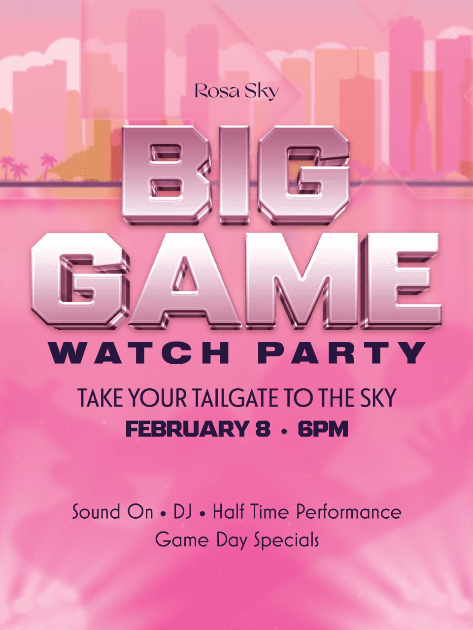 This Big Game Sunday, Rosa Sky takes game day to new heights! On February 8 starting at 6PM, Miami’s favorite rooftop lounge invites guests to take your tailgate to the sky with a high-energy Big Game Watch Party overlooking the city. The evening features sound-on viewing so fans won’t miss a single play, paired with live DJ entertainment, a halftime performance, and a lively rooftop crowd that keeps the energy high from kickoff to the final whistle. With sweeping city views and Rosa Sky’s signature ambiance, the experience feels more like a celebration than a standard sports bar watch party.