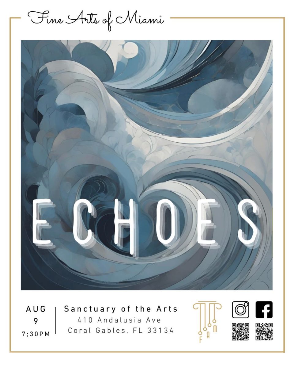 Concert Echoes is the third concert of the season presented by Fine Arts of Miami. A concert with a promise to captivate the senses with the beauty of classical music reverberating in a summer night. The carefully curated program features a selection of pieces that explores the concepts of echoes, both literal and metaphorical, spanning different eras and styles. A celebration of music and memory, where every note is a whisper from the past, echoing into the future. Opera and zarzuela arias, Musica di Camara, classical jazz and more.