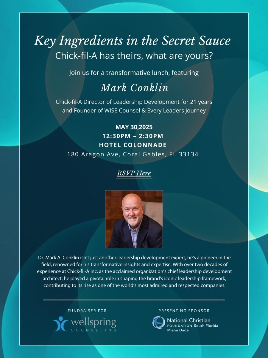 Join Wellspring Counseling for a special leadership luncheon featuring Dr. Mark Conklin, the former Chief Leadership Development Architect for Chick-fil-A. With more than 20 years shaping the leadership culture of one of the world’s most admired companies, Dr. Conklin will share key insights to help attendees uncover their own “secret sauce” for personal and professional growth.
