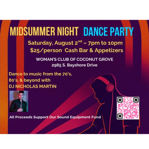 Woman's Club of Coconut Grove 2985 S. Bayshore Drive, Coconut GroveGet ready to hit the dance floor at the Woman’s Club of Coconut Grove! This festive Midsummer Night Dance Party promises an evening of great music, energy, and community spirit. DJ Nicholas Martin will keep the party going with an irresistible mix of hits spanning the decades—from Motown and disco to pop favorites and Latin […]