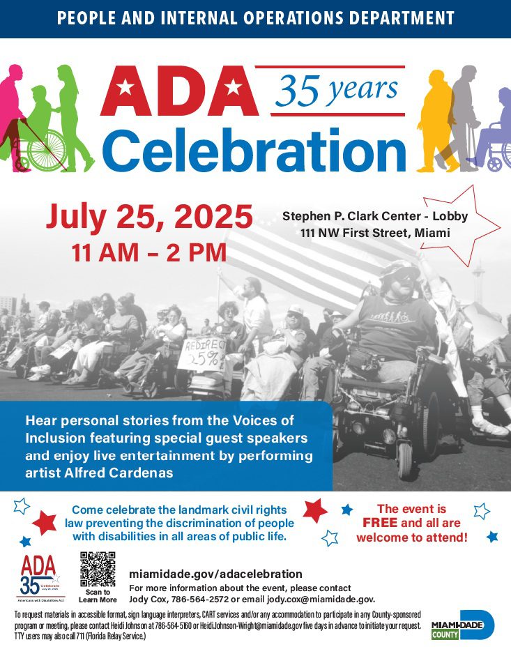 Stephen P. Clark 111 NW 1 St, Miami, FL, United StatesMiami-Dade County will celebrate the 35th anniversary of the Americans with Disabilities Act. Hear personal stories from the Voices of Inclusion featuring special guest speakers and enjoy live entertainment by the Miami Lighthouse for the Blind Youth Band and performing artist, Alfred Cardenas. The event is free.
