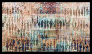 Her work often features overlapping silhouettes and fragmented forms, suggesting the invisible energy shared between people who move through the same space. She believes we each emit a kind of emotional frequency, a color or imprint that blends with those around us.