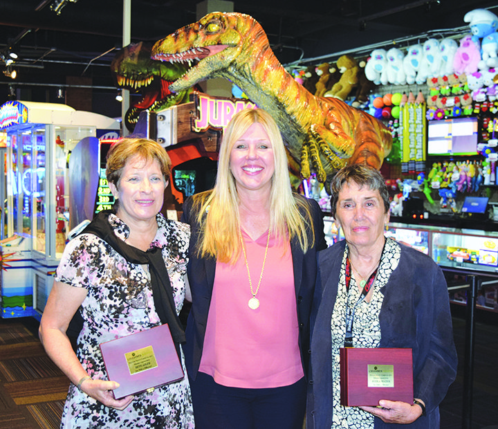 Palmetto Bay Councilmember and ChamberSouth Board member Karyn Cunningham (center) honors village residents Beth Adler (left) and Sheila Frazier, recipients of the Chamber’s 2017 Volunteer Appreciation Awards at GameTime in Sunset Place on May 10. The annual luncheon recognizes cherished volunteers among the ranks of local organizations and others who selflessly devote their time and talent to help others in the community.