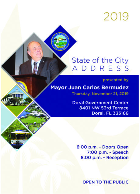 Mayor Juan Carlos Bermudez is set to deliver the 2019 State of the City Address November 21, highlighting the city’s accomplishments of the past year and to speak on what is ahead for 2020. Doors open at 6 p.m., the address begins at 7 p.m., followed by a reception sponsored by Baptist Health of South Florida.