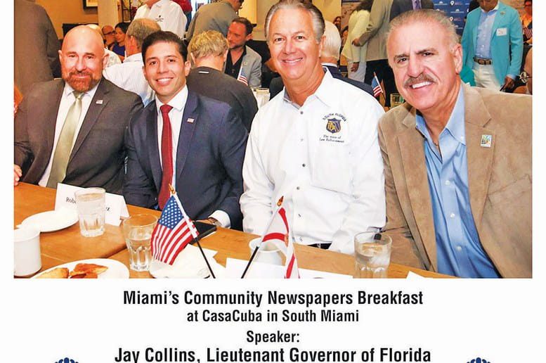 Pictured at Miami’s Community Newspapers’ Dec. 16 breakfast at CasaCuba in South Miami are (l-r) Lt. Governor of Florida Jay Collins, Miami-Dade Commissioner Roberto J. Gonzalez, executive vice president of the South Florida Police Benevolent Association David Greenwell, and Zoo Miami goodwill ambassador/communications director Ron Magill.