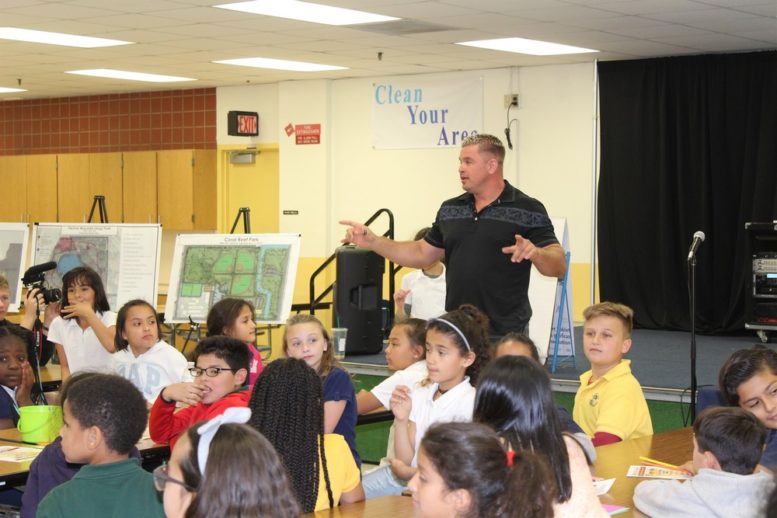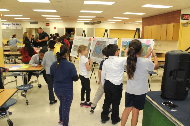 Palmetto Bay Policing Unit Commander Major Gady Serralta spoke to the students briefly about what to do in dangerous situations, and there was a question and answer session. Then the students were asked to write their suggestions for making the village parks better on sticky notes and place them on large maps of the various parks.
