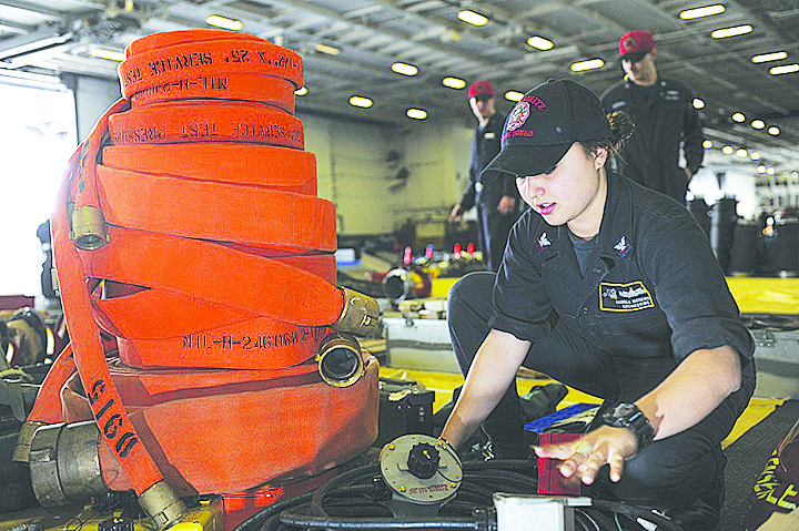 Damage Controlman Third Class Andrea Moreno, a native of Miami, lays out equipment in preparation for a mock inspection in the hangar bay of the aircraft carrier USS Nimitz (CVN 68). Nimitz currently is in San Diego preparing for the Board of Inspection and Survey (INSURV) leading up to a 2017 deployment.